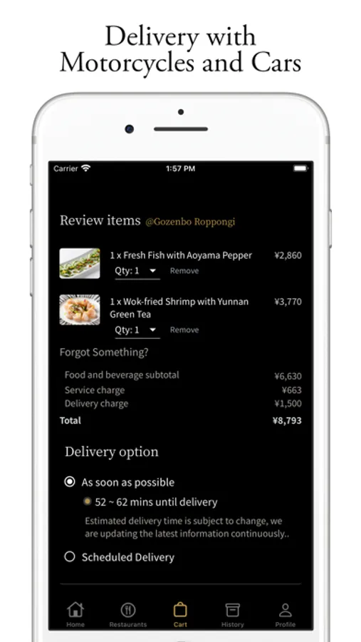Once ready, your meal is immediately picked up by one of our professional full-time uniformed drivers dispatched in advance who will go straight to your address without doing any other pick-up or drop-off.