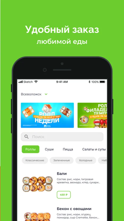 Скачайте наше приложение, выбирайте свой филиал для заказа и заказывайте вкусные роллы и пиццу!