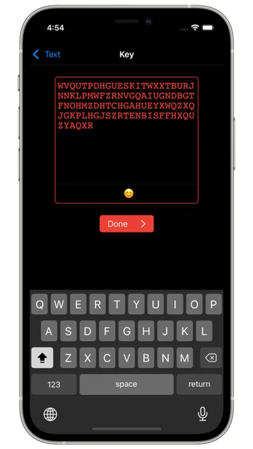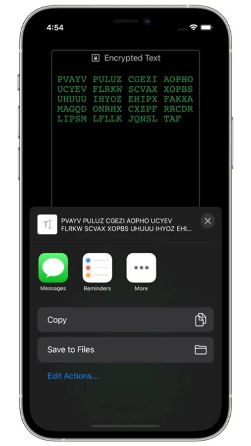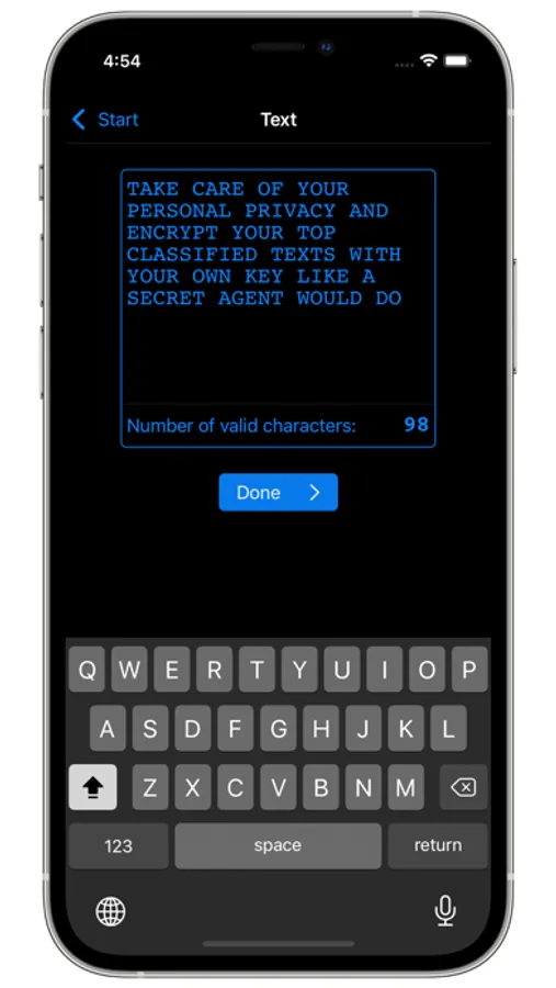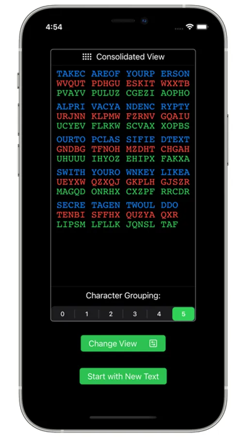 You can group the characters of the encrypted/decrypted texts to different word lengths and you can share your texts with other applications. SimplePrivacy also provides a consolidated view where you can directly see how the encryption works, by putting plaintext (blue), key (red) and encrypted text (green) below each other.