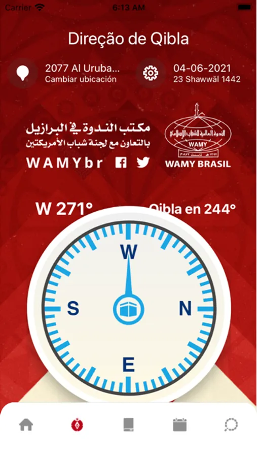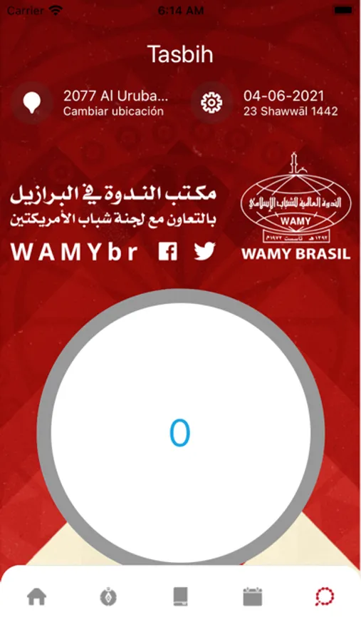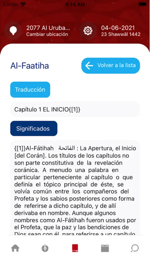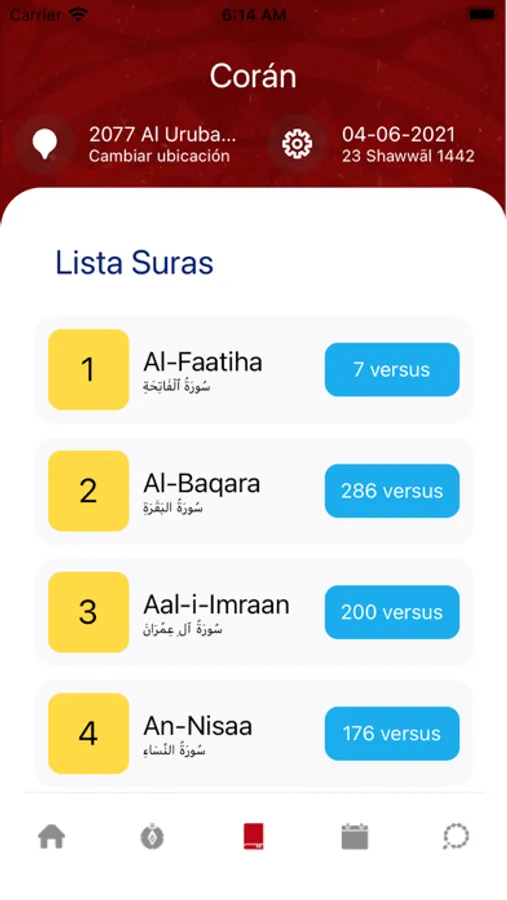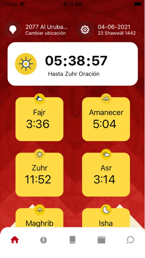 tiempos de oración, versículos del Corán y la dirección de la Kaaba. Dirigido a países de América del Sur que habla en español (América Latina)