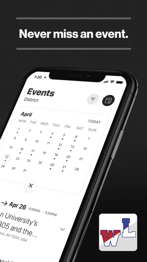 The event section shows a list of events throughout the district. Users can add an event to your calendar to share the event with friends and family with one tap.