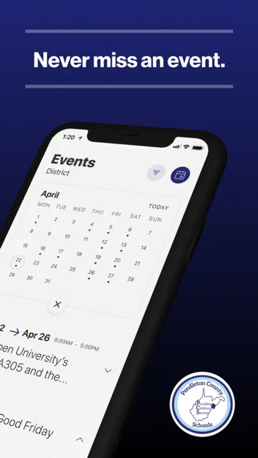 The event section shows a list of events throughout the district. Users can add an event to their calendar to share the event with friends and family with one tap.
