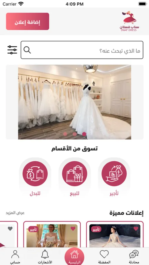 تطبيق سناب فستان هي أول منصة تربط بين نساءالوطن العربي.تطبيق سناب فستان يقدم حلول مبتكرة بحيث يمّكنالسيدات من الإستفادة من الفستان وغيره مثل الشنطوالساعات والإكسسوارات التي تكون محتفظه بجودتهابحيث يمكن عرضه داخل التطبيق إما للبيع أو الإيجار أوالبدل.
