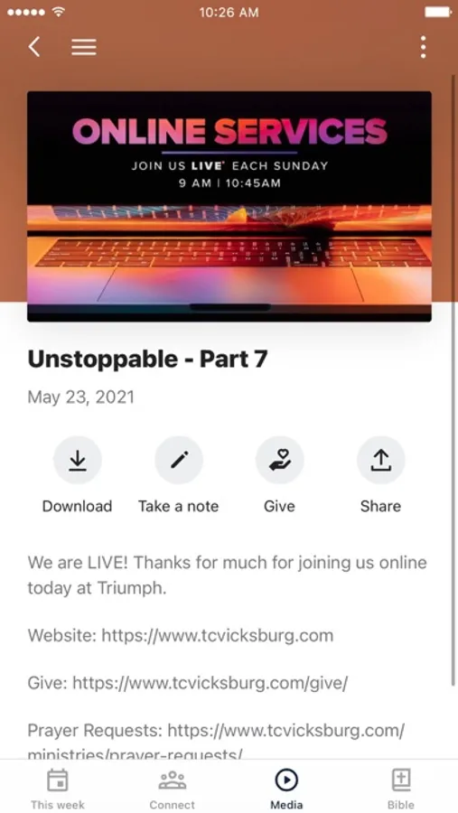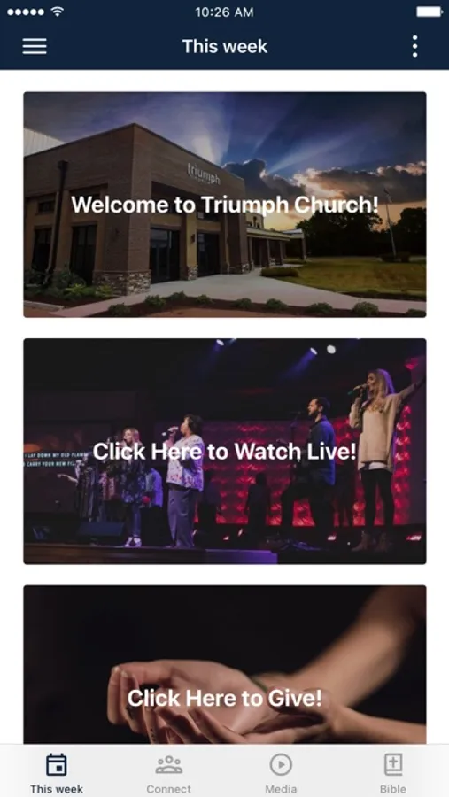 This app will help you stay connected with the day-to-day life of our Triumph Church. With this app you can: watch or listen to past messages; stay up to date with push notifications; share your favorite messages via Twitter, Facebook, or email; and download messages for offline listening.