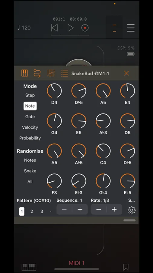 With the randomiser, you can randomise the notes, the snake pattern or all parameters at once.