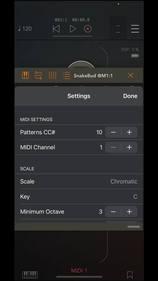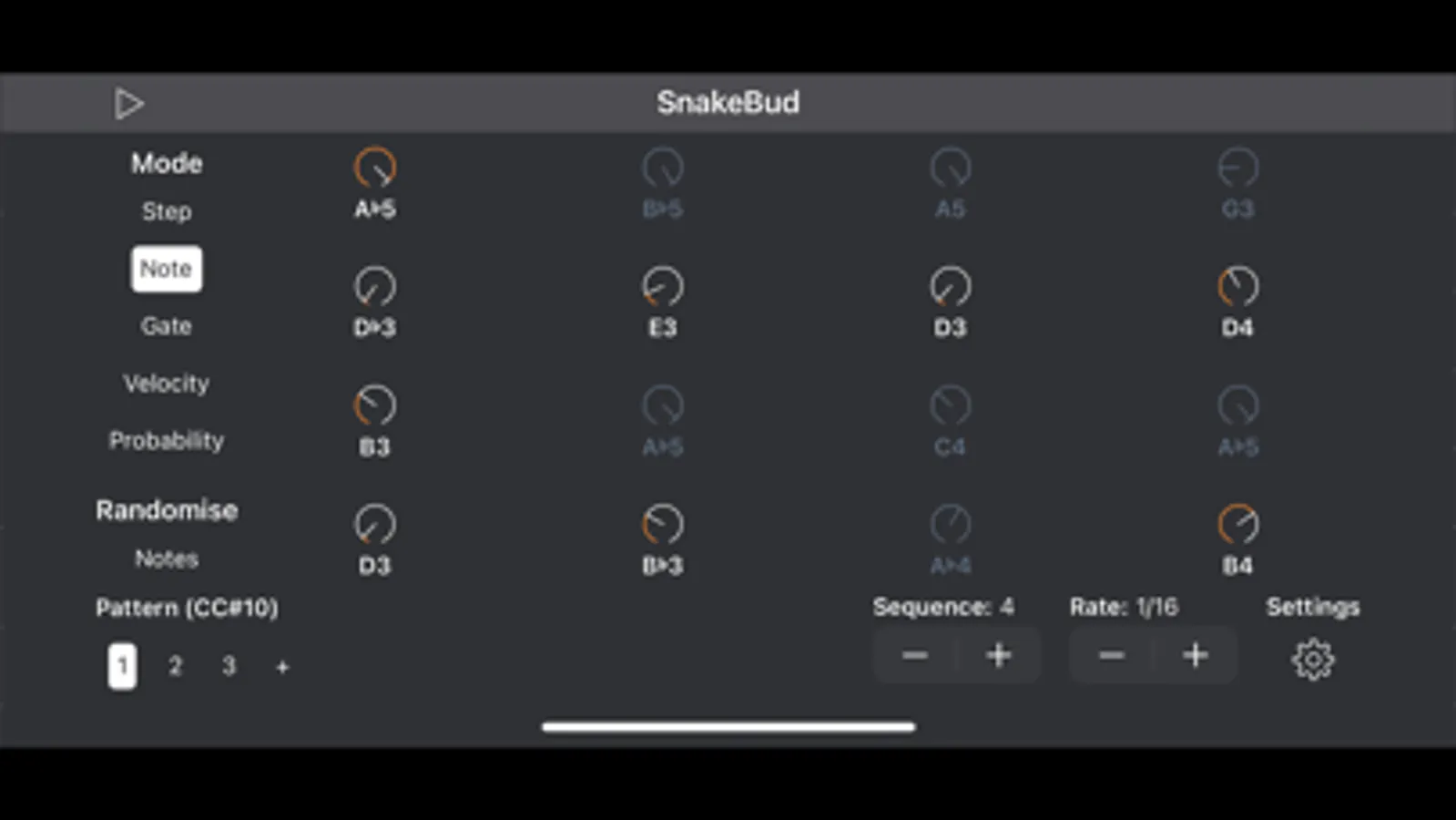 SnakeBud is a 16-step AUv3 MIDI Sequencer with a 4x4 grid. You can set the note, gate, velocity and probability values for each step and you can also toggle them on/off.