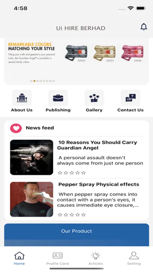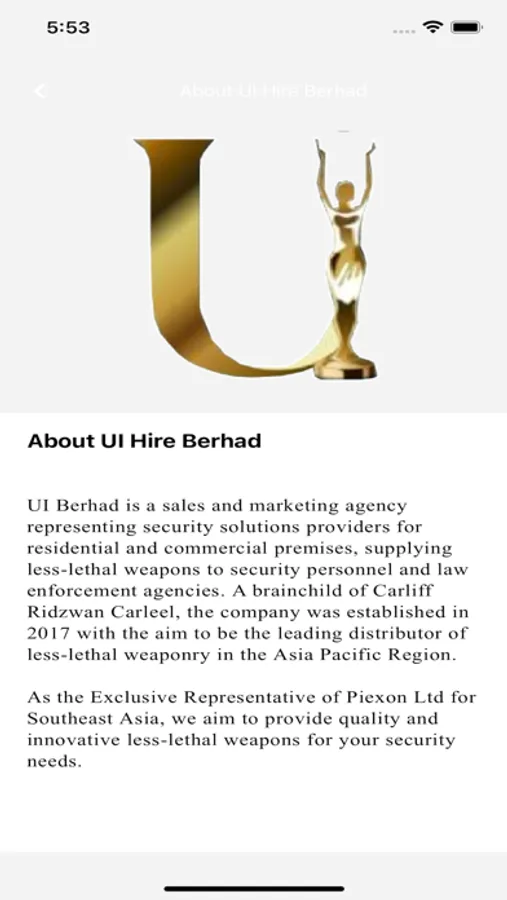 UI Hire Berhad is a sales and marketing agency representing security solutions providers for residential and commercial premises, supplying less-lethal weapons to security personnel and law enforcement agencies. A brainchild of Carliff Ridzwan Carleel, the company was established in 2017 with the aim to be the leading distributor of less-lethal weaponry in the Asia Pacific Region. Download our app to get latest company news and announcement, product informations and media sharing.