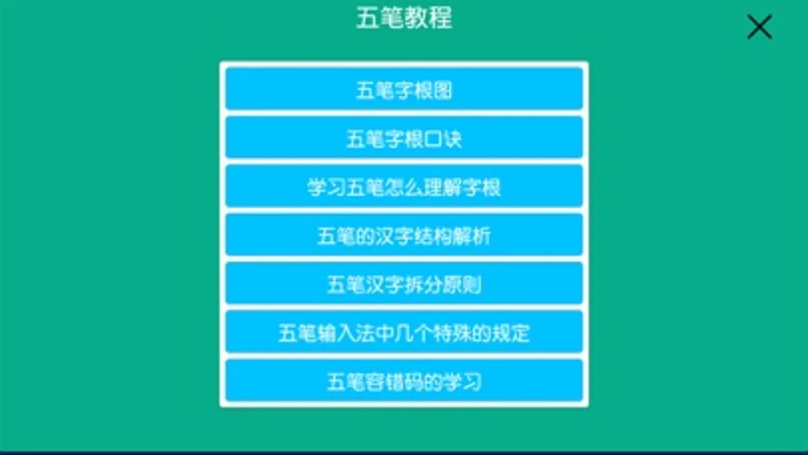 本软件包含五笔教程,打字练习,编码查询功能。五笔教程,则包了大量五笔学习资料。包含字根图表,背诵口诀,字根理解,汉字分析原则,容错码,等基础知识。还有一级,两级,三级,四级简码及词组的拼写方式。打字练习,则包含了字根,一二三四级简码,疑难复杂字,与海量词组打字练习。编码查询,根据汉字反查五笔码,再也不怕拼不出五笔了。