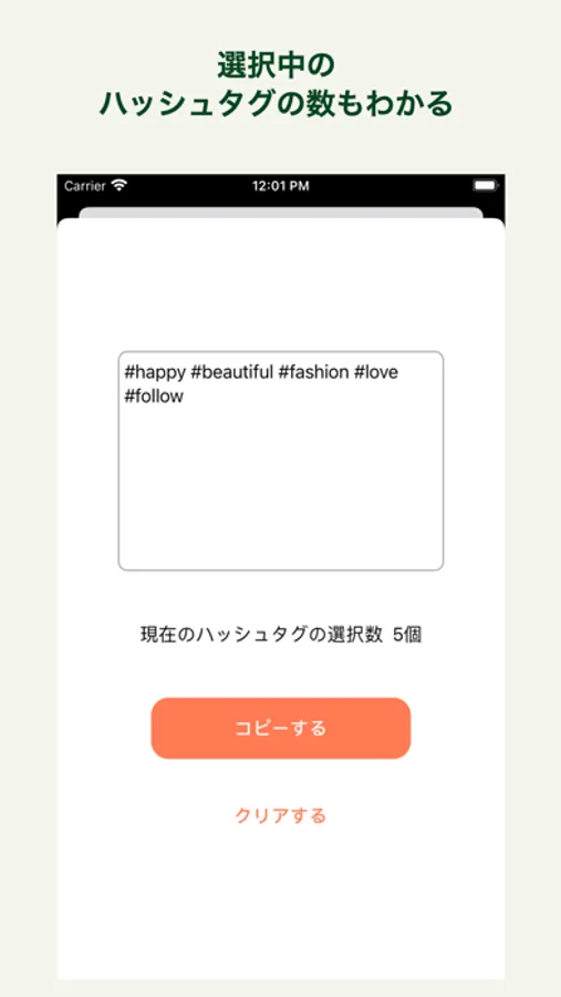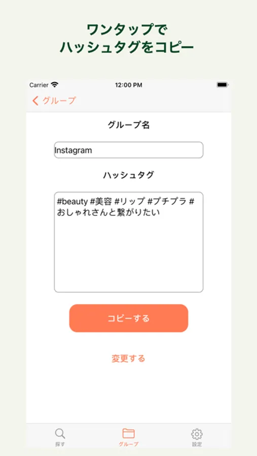 ハッシュタグをグループにして、まとめて管理して、それをワンタップでコピーすることができます。