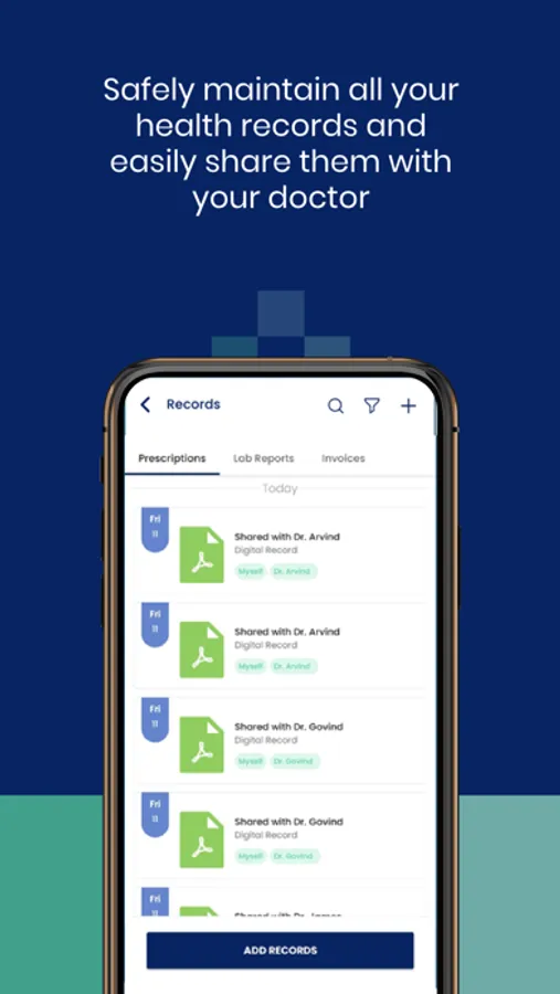 With DearDoc’s digital record management system, you can store all your prescriptions, lab reports, and other records in a safe and easy to search place so that you can easily share those with your doctors and will never have to worry about losing them.