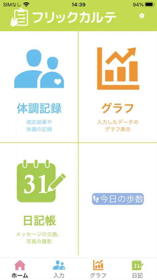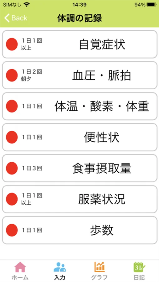 ・自覚症状(抗がん薬治療によって生じる副作用の症状)、体温、血圧、脈拍、体重、酸素飽和度、便性状、食事摂取量、服薬状況、歩数、の記録ができます。