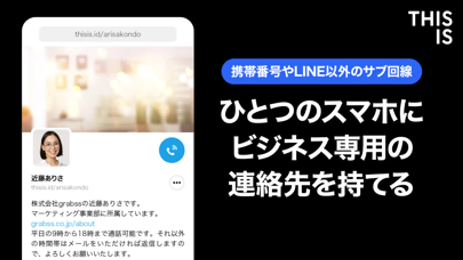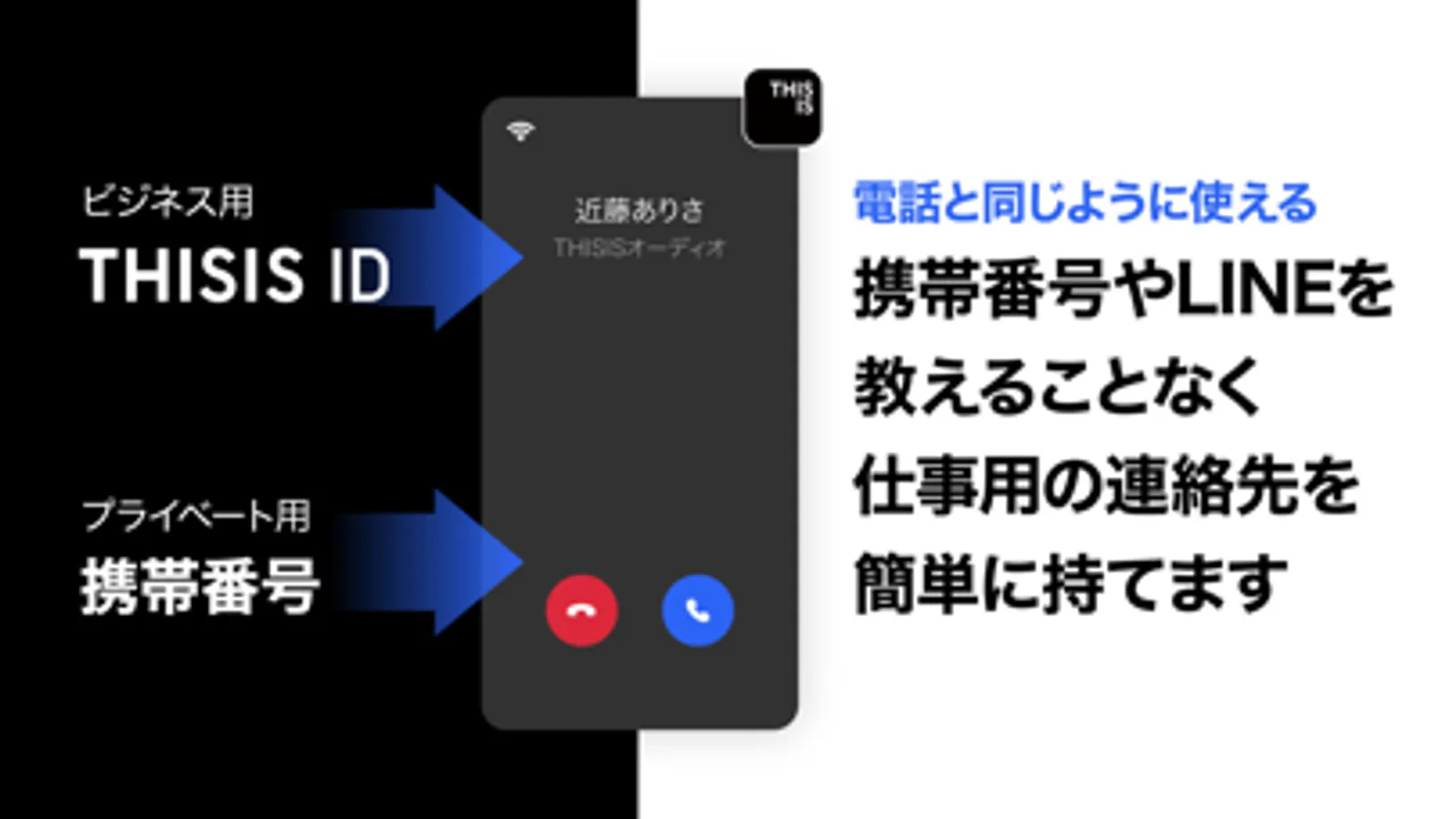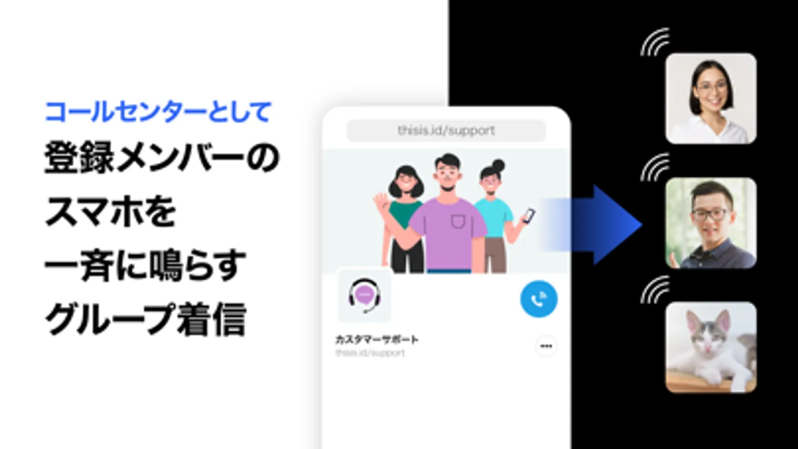 THISIS IDを登録するだけで、あなたのスマホに携帯電話番号以外の通話窓口を開設できます。仲間とグループを登録すれば、通話がメンバーのスマホに一斉に着信するグループ着信機能もあるので、仕事の問い合わせや予約受付窓口としてのご利用に最適です。