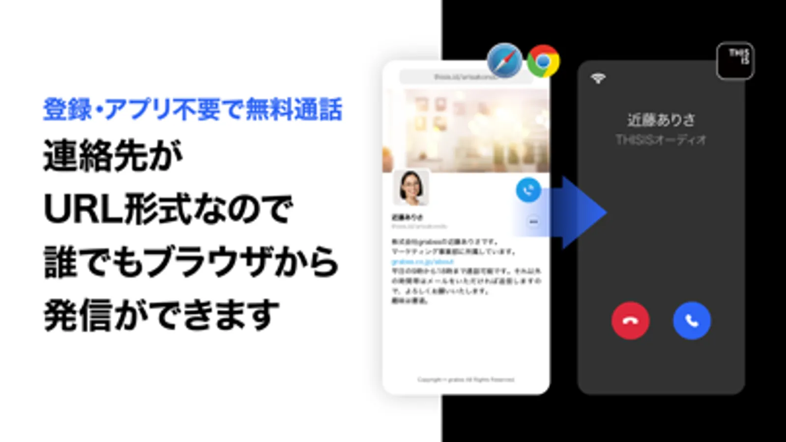 THISIS IDはURL形式。発信者に専用アプリや会員登録、友達申請など一切必要なく、ブラウザからあなたのTHISIS IDにアクセスするだけで発信できます。URLなのでもちろん全世界共通です。