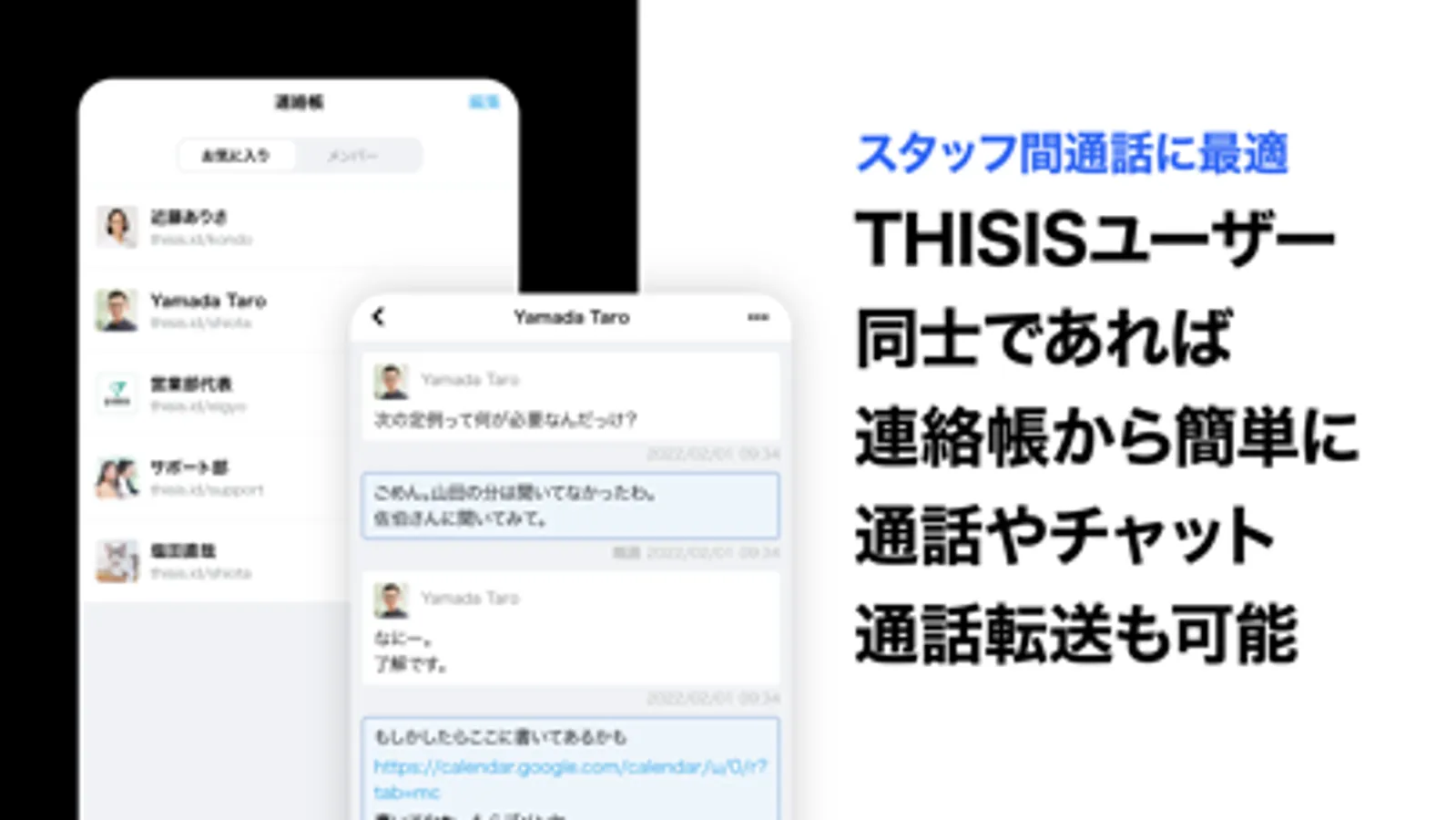 同じ契約下にあるTHISIS ID同士なら自由に通話を転送できます。お問い合わせの内容によって仲間のスマホへ通話を取り継げるので、自分のスマホを使って内線電話のような連絡網が構築できます。