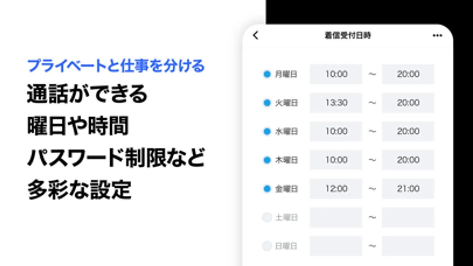 仕事用に平日の9時から18時の間だけ着信可能にしたり、お店の定休日に合わせて曜日を設定したり、一般の電話では難しい設定も自由自在です。