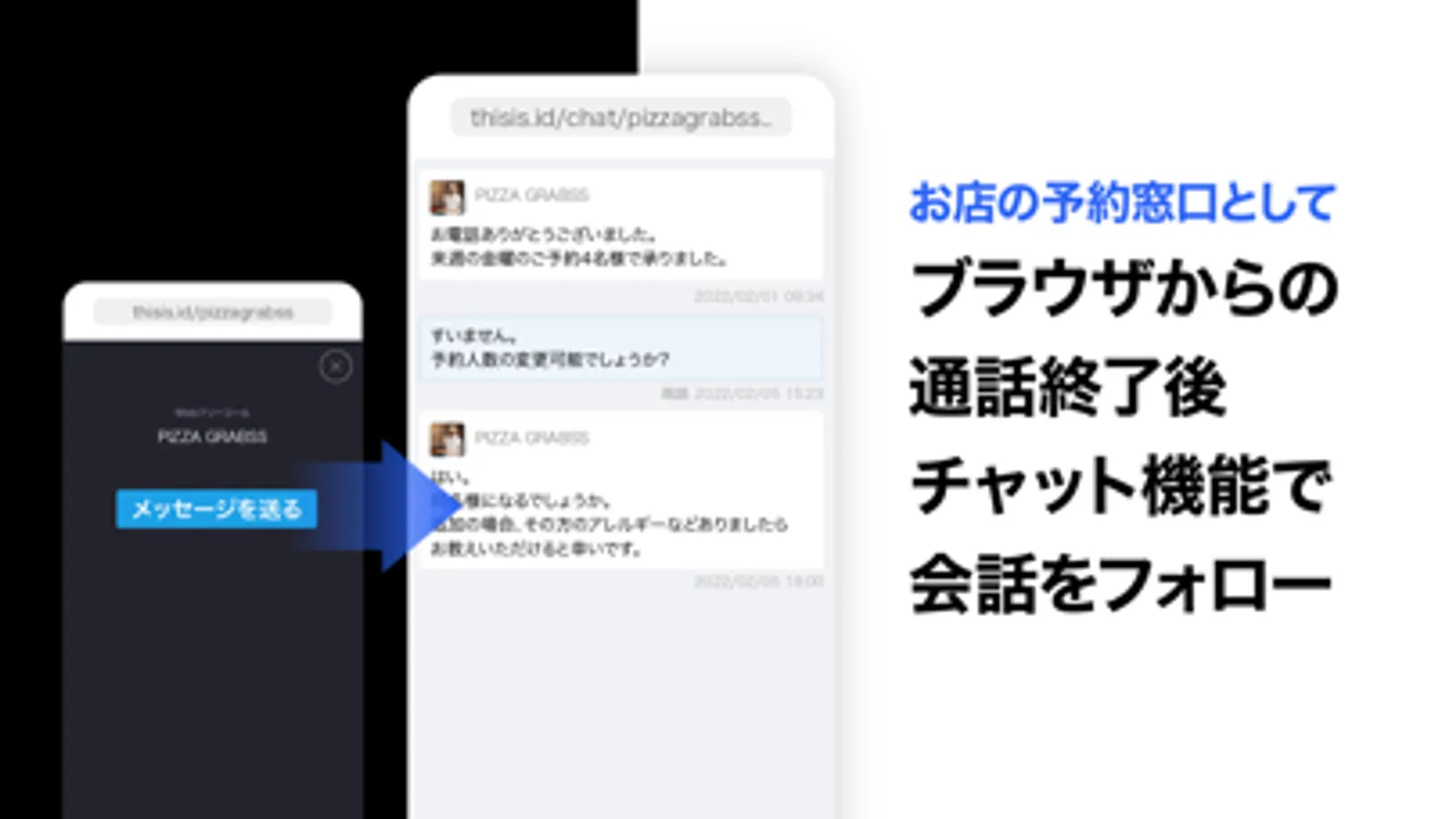 THISISは通話だけでなくテキストメッセージの送受信も可能です。THISISユーザー同士はもちろん、ブラウザからアクセスしたゲストユーザーともメッセージが送受信できます。チャット利用時にメールアドレスを登録すれば、チャットルームのURLや新着メッセージがゲストユーザーにメール通知されます。