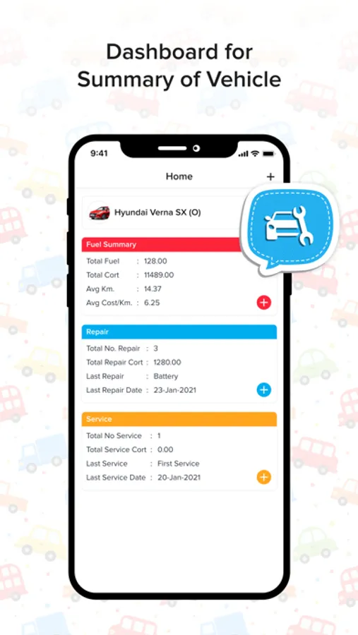 Just input your vehicle data and its details like services, fuel, repair, etc. All data represent in the dashboard so you can track it easily.