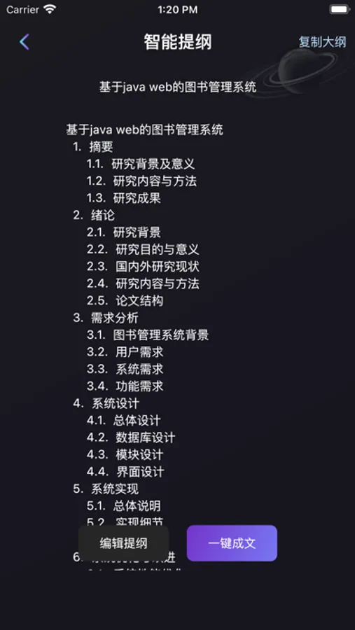 1、长文一键生成:我们可以一次成文5万字。论文板块(适用于其他长文),系统会先返回论文大纲,这样用户就可以对大纲进行编辑和调整。然后,当用户完成大纲编辑后,只需要点击一键成文,系统就可以将文章自动拼接起来。