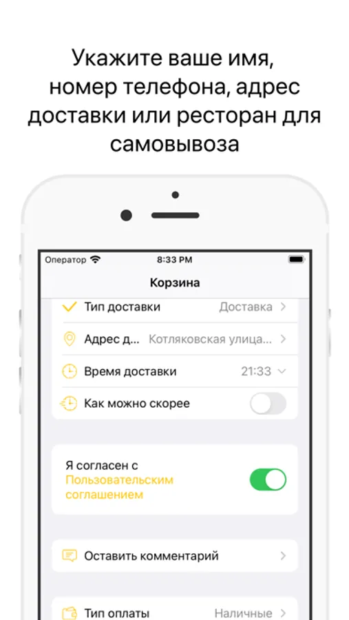 Укажите время, когда хотите прийти за своим заказом или выберите доставку с указанием времени и адреса доставки.