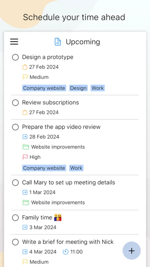• All the scheduled tasks are laid out in the Today and Upcoming lists.