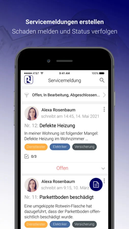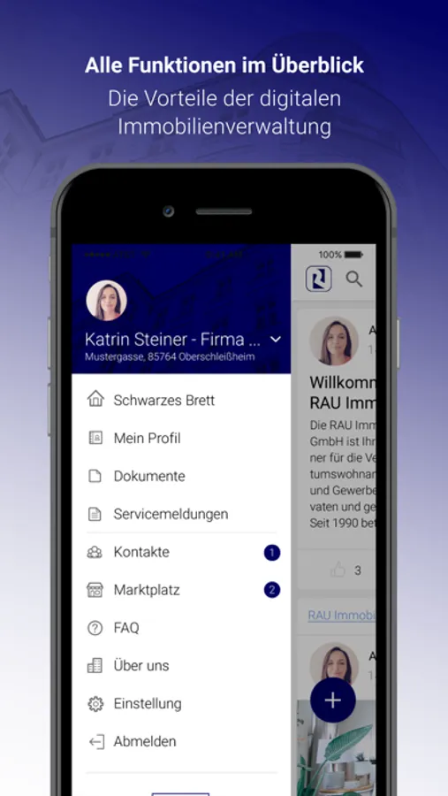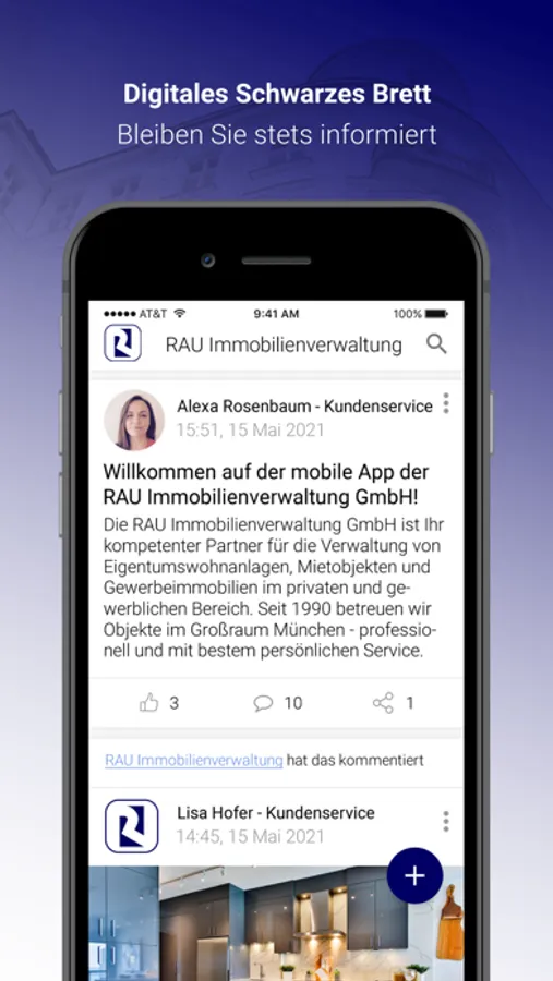 Als Kunde der RAU Immobilienverwaltung GmbH profitieren Sie von einem besonders innovativen Kundenservice, der Ihnen viele Freiheiten bietet. Mit der RAU Immobilien App können Sie uns rund um die Uhr Anliegen und Schäden inklusive Fotodokumentation per Smartphone melden. Zusätzlich stellen wir Ihnen eine digitale Dokumentenmappe mit wichtigen Dokumenten für Ihre Immobilie(n) zur Verfügung. Über das digitale schwarze Brett informieren wir via Push-Nachricht proaktiv über wichtige Informationen rund um die uns anvertrauten Immobilien.