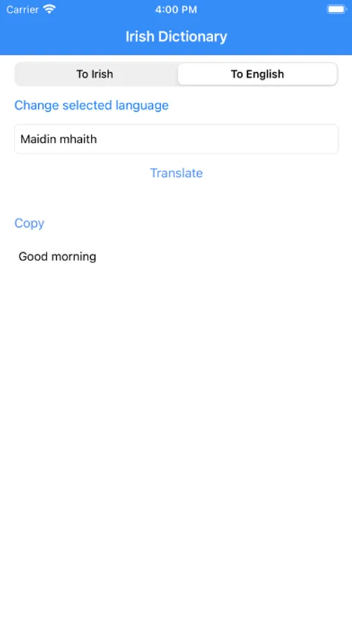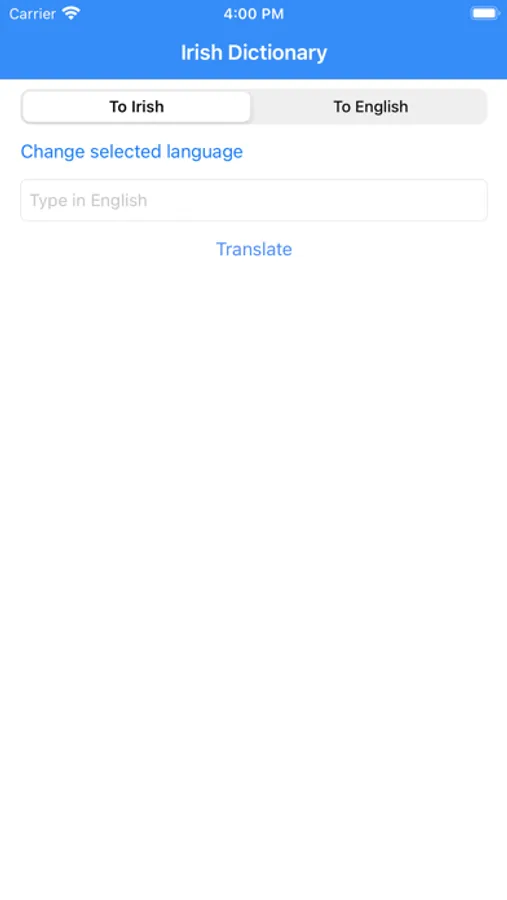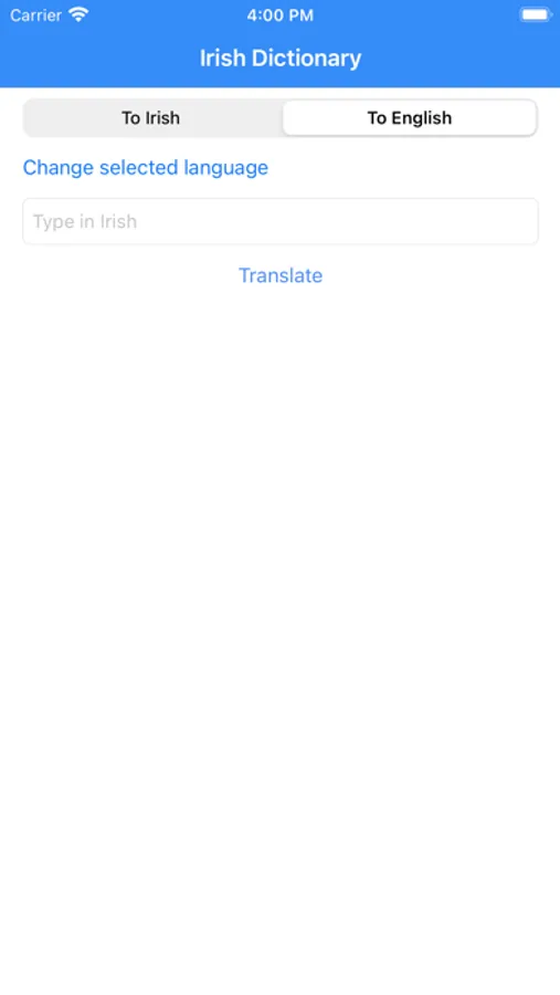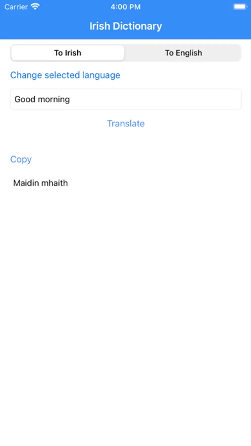 Using this app you translate Irish to English, not limited a single word, you can translate multiple sentences. You can translate English to Irish as well.