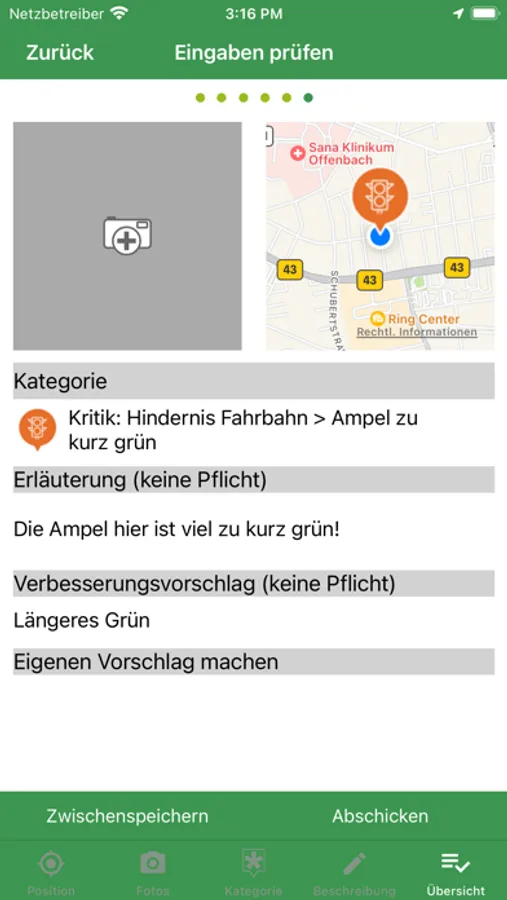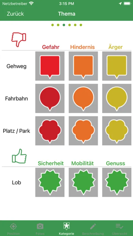 Die App will den Fußverkehr stärken. Sie erfasst Gutes und Schlechtes fürs alltägliche Gehen: zu schmale Wege, gefährliche Kreuzungen, idyllische grüne Pfade und vieles mehr. Die Bedienung ist einfach: Position checken – Foto machen – mit zwei Klicks das Thema für Kritik oder Lob festhalten – abschicken.