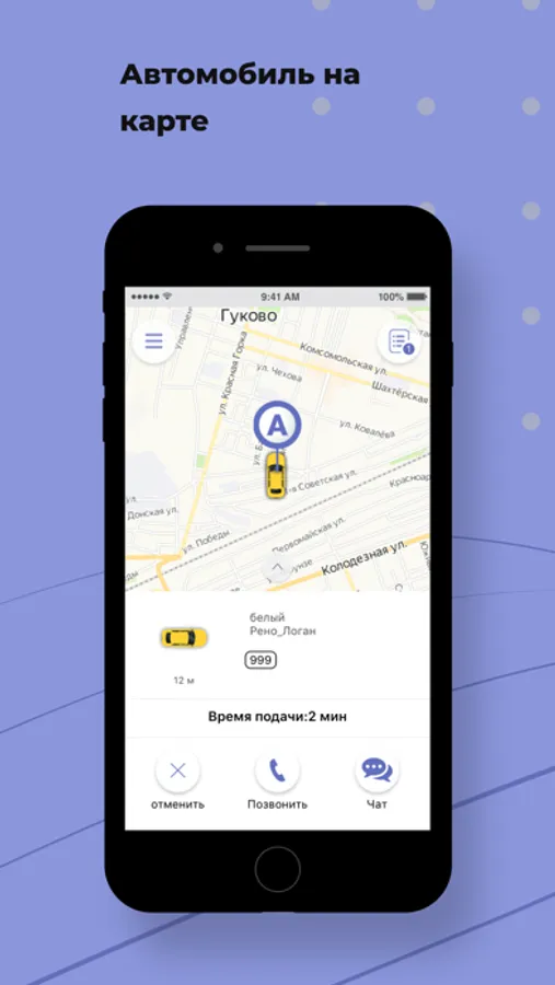 Ты всегда видишь на экране полную информацию о заказе: время подачи, марка, цвет и номер машины, имя водителя.