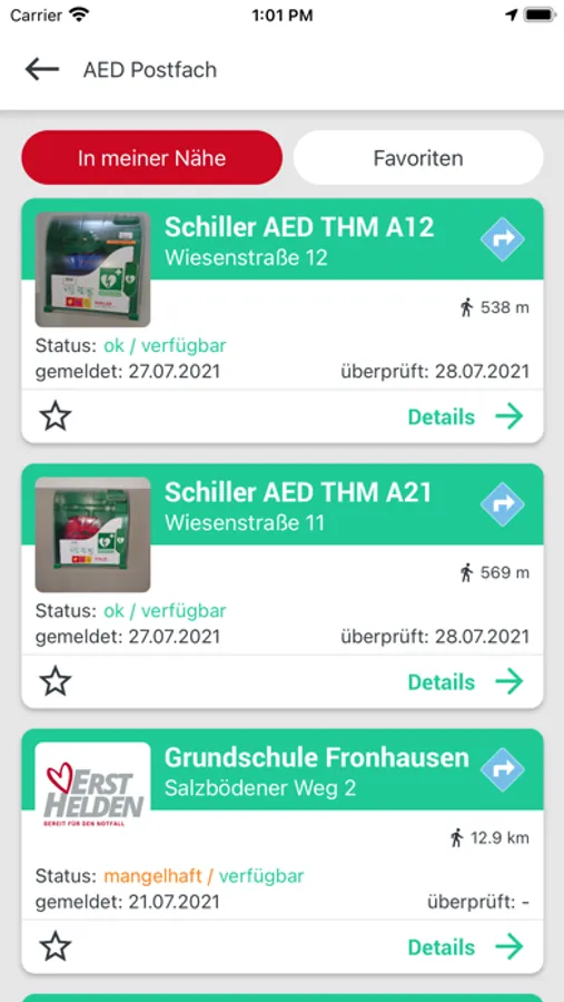 Selbst erfahrene Ersthelfer wissen in solchen Ausnahmesituationen nicht, wo genau ein AED aufzusuchen ist. Genau hierbei hilft dir die App, sie zeigt dir die nächstgelegenen AEDs in deiner Nähe an und navigiert dich dort hin.