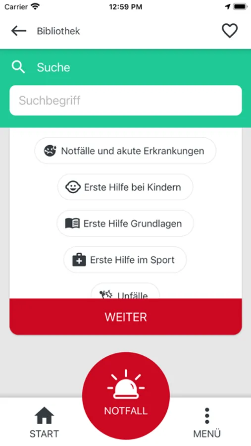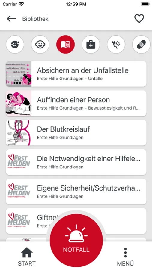 Neben dem Bereich AED, findest du eine Erste-Hilfe Bibliothek in der die wichtigsten Notfallsituationen illustriert und erklärt werden. Lerne einfache Maßnahmen und bleib am Ball, um Erste-Hilfe leisten zu können, wenn es ernst wird. Werde auch du ein ErstHeld!