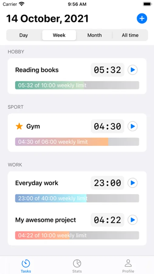 - Track time daily. View by weeks and month
