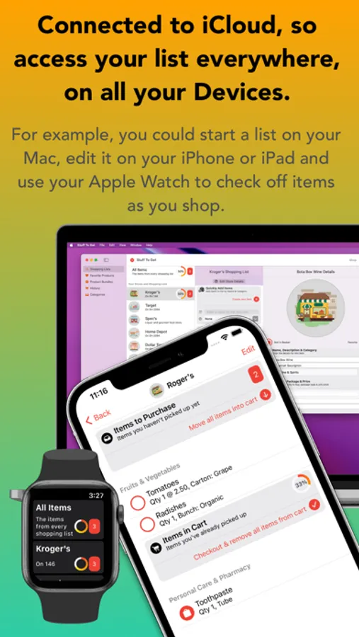 That means you could start a list on your Mac, edit it on your iPhone or iPad and use your Apple Watch to check items off the list as you shop. Stuff To Get will always keep everything in sync.