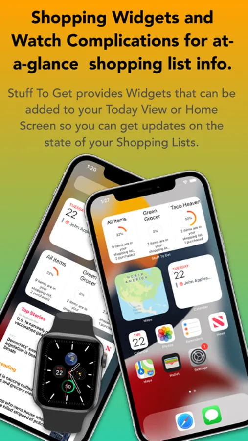 Stuff To Get provides a Widget that can be added to your Today View or Home Screen so you can get at-a-glance info on the state of your Shopping Lists. Additionally, Stuff To Get provides a Complication that can be added to the face of your Apple Watch.