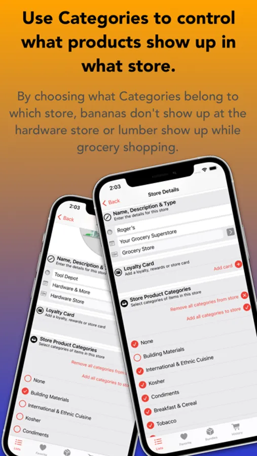 By choosing what Product Categories belong to which Store, you can control the list of Products displayed when adding an item to a Shopping List. So bananas will never show up when adding items to a hardware store or lumber show up when editing your grocery list.