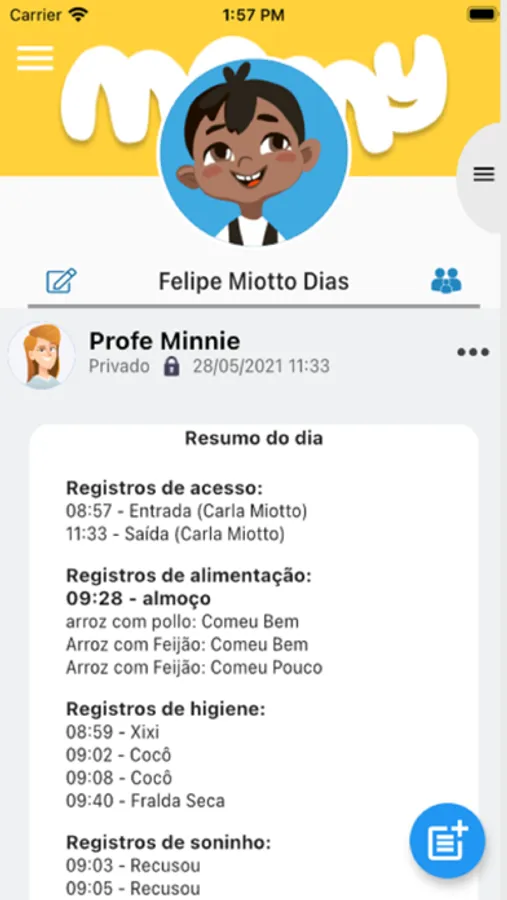 Em formato de uma rede social, a escola registra as atividades e ocorrências da criança por um tablet, celular ou computador e o pai recebe as notificações em tempo real.
