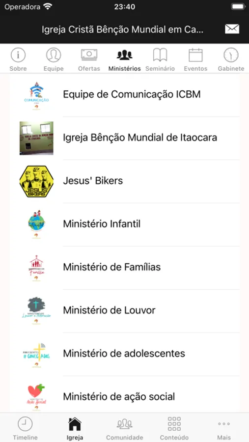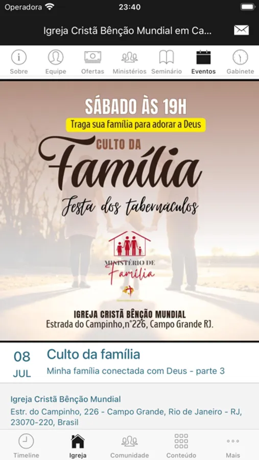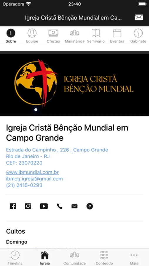 - Informações da Igreja (endereço, telefone, site, redes sociais, pastores)