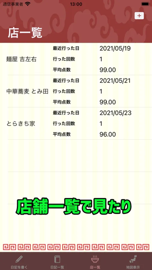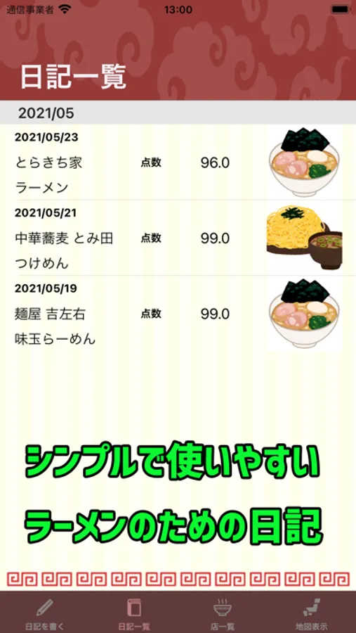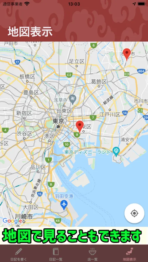 2.振り返りたいときには、「日記一覧」、「店舗一覧」、「地図表示」から見ることができます