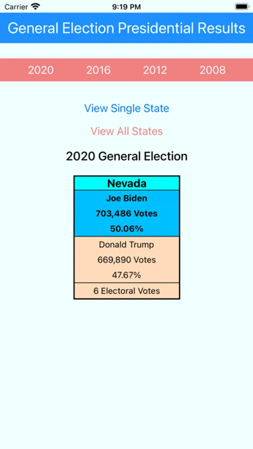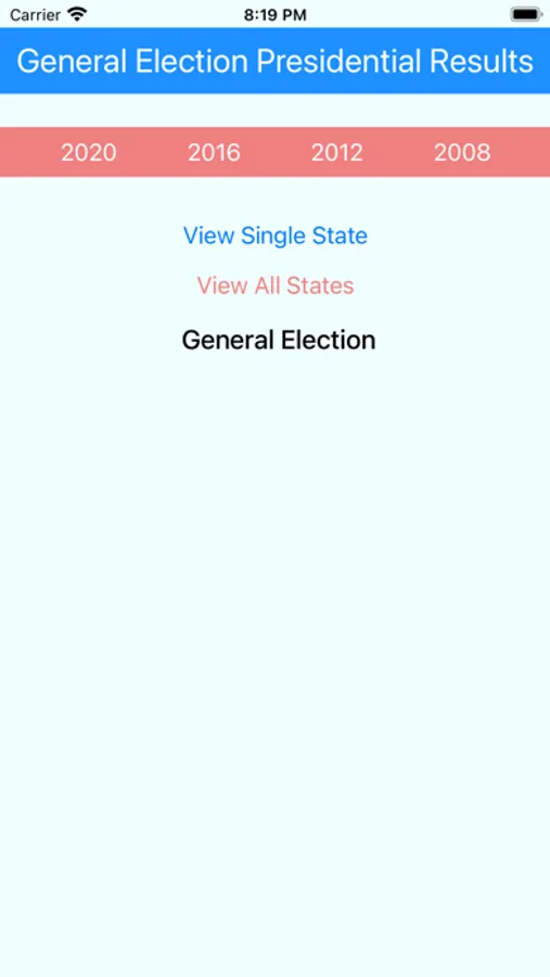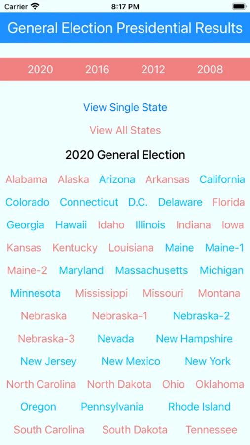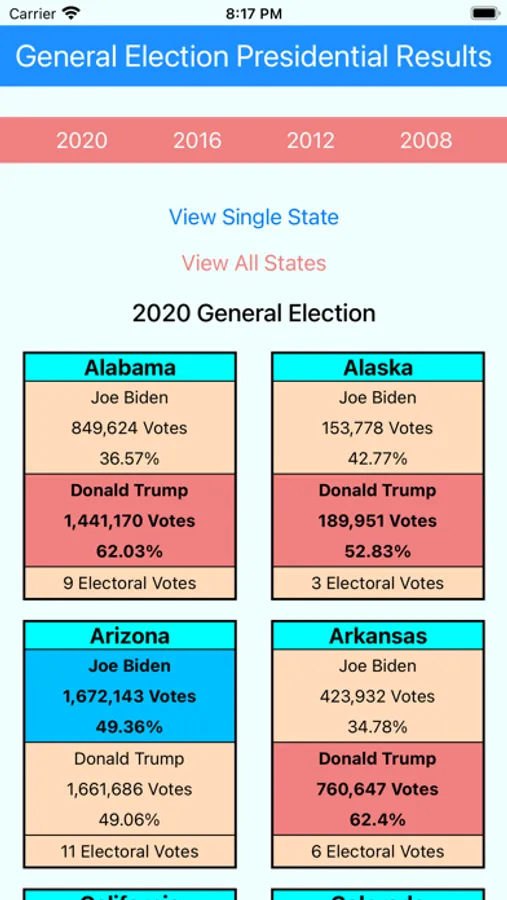 General Election Presidential Results (GEPR) App allows users to look up United States general election results ranging from the historical 2008 election to the most recent 2020 election. Democratic and republican presidential candidates will be displayed under each state with the number and percentage of votes each candidate received. Users will be able to search by election year and display all 50 states at once or individually.