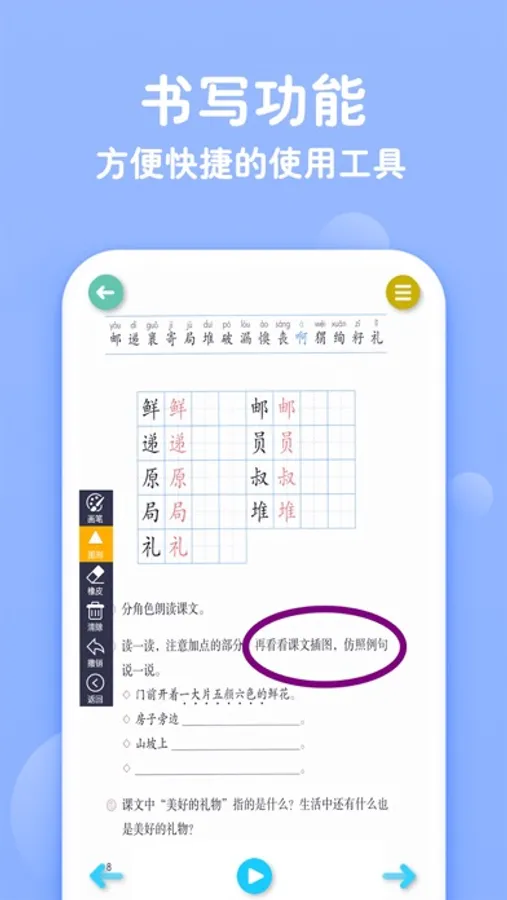 【4】画笔功能,全屏涂鸦让学习更加的有趣让学习更加高效率。完全同步最新发行教材,绝无缺漏页现象。