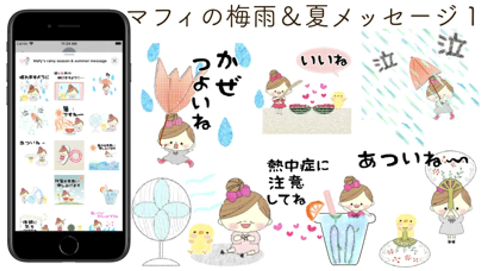 梅雨から夏にかけて使える動くステッカーです。お団子ヘアの女の子”マフィ”がかわいく動いてステッカーに登場。こちらのステッカーでは、お名前が入っておりませんのでたくさんの方へご利用いただければ幸いです。Created by Faa Industry