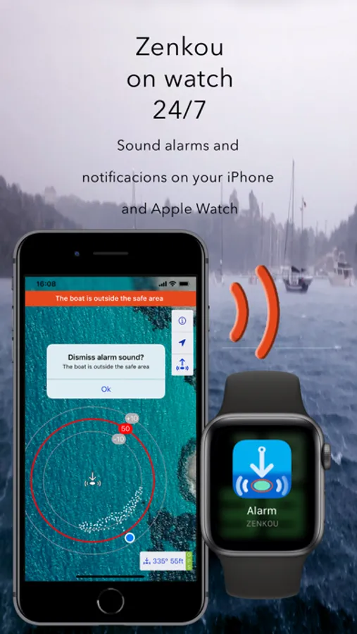 Receive iPhone alerts on your Watch or monitor your yacht in real time with the Anchor Watch LIVE app* by Zenkou