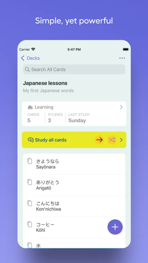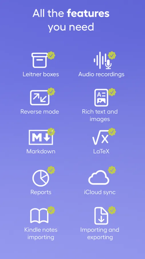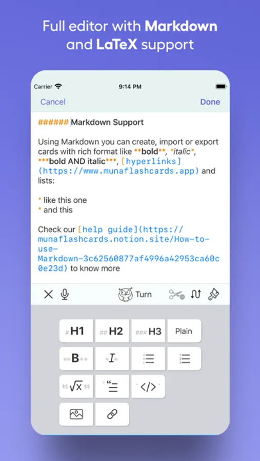 With modern features like Markdown formatting, LaTeX support, and audio recordings Muna is ideal both for both casual and advanced flashcard users.