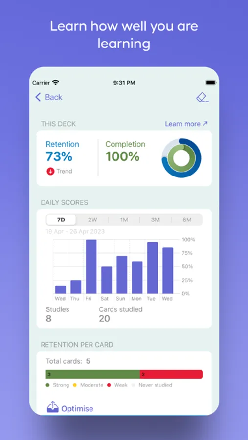 * Reports — check stats on retention, completion, daily scores and more. Then optimise your deck with one click (PRO version).