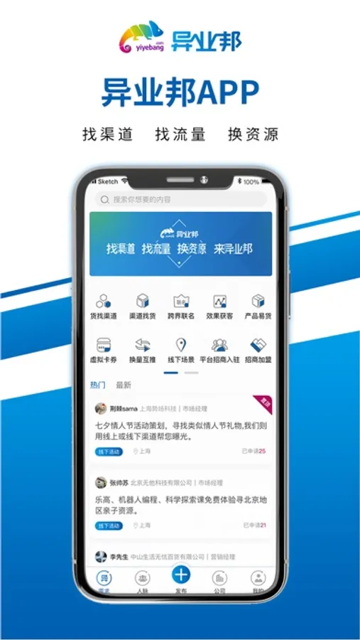 异业邦成立于2015年,是异业合作跨界营销的商务对接平台。帮助品牌主快速找渠道、找流量、换资源,实现营销资源的有效利用。平台链接了超过百万的品牌主、渠道商和流量服务商。