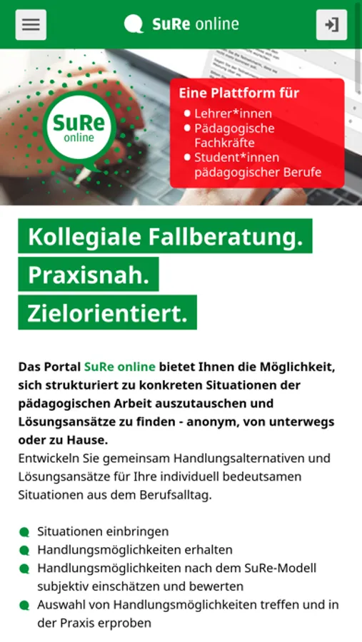 Kollegiale Fallberatung direkt auf dem Smartphone oder Tablet: SuRe online basiert auf dem Modell SuRe (Subjektive Relevanz nach Prof. Dr. Clemens Seyfried). Werden Sie Teil einer multiprofessionellen Online-Community, die selbstgesteuert und zielorientiert Handlungsmöglichkeiten für Situationen aus dem pädagogischen Berufsalltag entwickelt. Die Auswahl der Handlungsmöglichkeiten wird durch vier Kriterien erleichtert, so kann eine für sich selbst stimmige und subjektiv relevante Handlungsoption bestimmt werden – vollkommen anonym, zeit- und ortsabhängig.