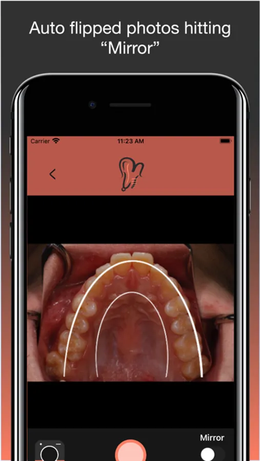The photo taken from the custom camera interface will be automatically cropped to 3:2 aspect ratio. Also, the custom camera interface provides mirror switch for dentists who take a photo though intra-oral mirrors. The photo taken from mirror switch function will be flipped and cropped to the proper alignment.