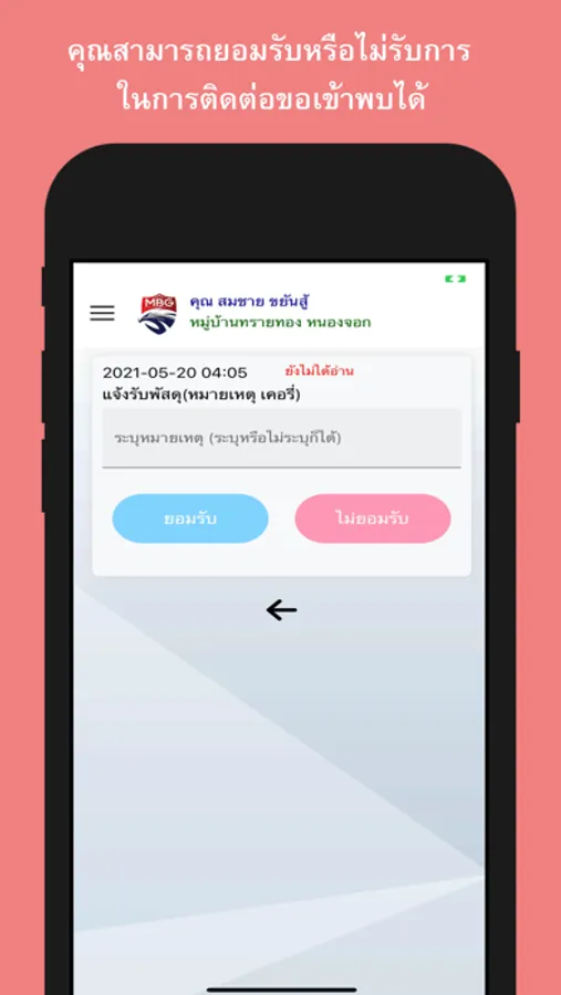 ช่วยให้ทุกการติดต่อขอเข้าพบที่บ้านของคุณ เช่น การส่งพัสดุ บุคคลขอเข้าพบ มีการคัดกรองจาก รปภ. ของ MBG เสมอ ทำให้ปลอดภัยและเป็นส่วนตัวยิ่งขึ้น มีการแจ้งเตือนจาก รปภ. มายังแอพพลิเคชั่นนี้ตามที่คุณได้ลงทะเบียนลูกบ้านเอาไว้ผ่านทางการแจ้งเตือนของมือถือและ SMS และให้คุณสามารถตอบกลับการอนุมัติไปยัง รปภ. ที่แจ้งเข้ามาได้