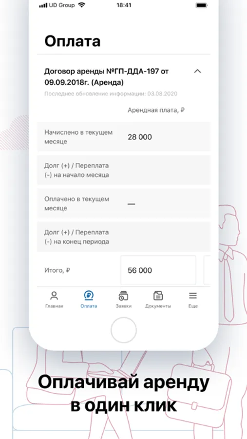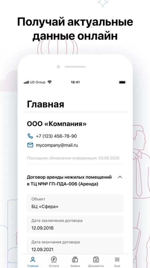 Приложение UD Group предназначено для клиентов компании. Получайте актуальные данные онлайн, оплачивайте аренду в один клик, создавайте заявки, отслеживайте их исполнение.