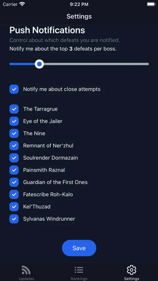 The days of refreshing a progress tracker endlessly to stay in the know about race progress are over. This app will send you push notifications for up to the 10 first defeats of each encounter. Only care about the very first defeat? You can customize notifications based on your preferences.