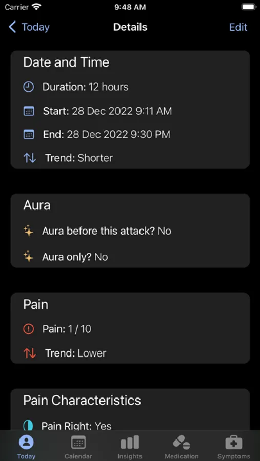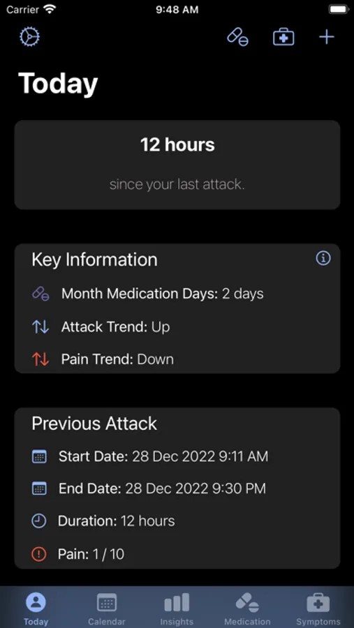 - View your attack days, average monthly pain and medication use as graphs to compare trends over time.